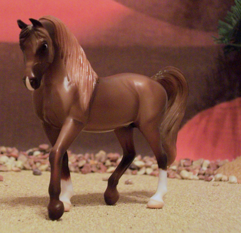 Bred homozygous chestnut; heterozygous rabicano, sabino, and grey: 100% chance of producing chestnut foals when covered by chestnut stallions; 25% chance of producing chestnut foals when covered by bay or black stallions. 50% producer of “flash”; 50% chance of foals greying out with age when covered by non-grey stallions; 100% chance of foals greying out with age when covered by grey stallions. One in three chance greying foals will be “bloody shouldered”. (Note: there is actually no real way to predict whether or not the “bloody shoulder” pattern will develop, but since her sire will produce bloody shouldered foals, this is the percentage I have chosen for Ka’Serket for PA purposes.)